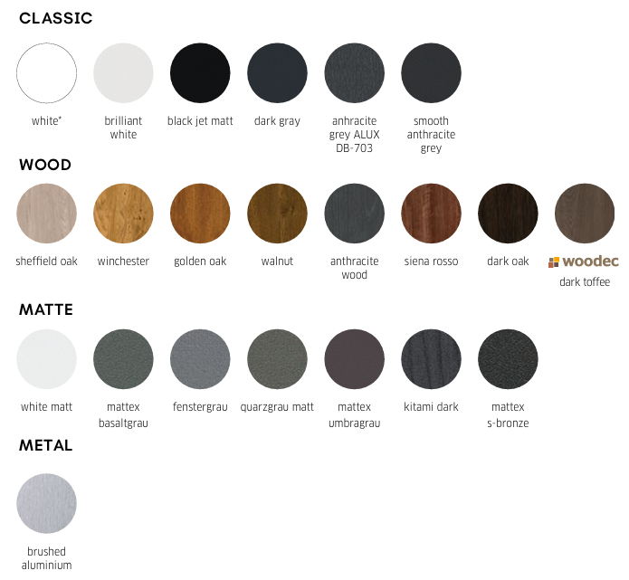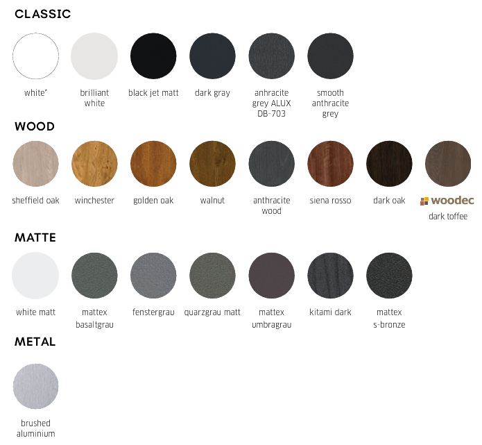 Oknoplast windows are available in a wide variety of colors to match any vision or aesthetic. You can choose from 50 veneer colors.